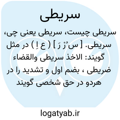 سریطی. [ س ُرْ رَ ] ( ع اِ ) در مثل گویند: الاخذ سریطی والقضاء ضریطی، بضم اول و تشدید را در هردو در حق شخصی گویند که در ادای دین تهاون ورزد و تعلل پیش آورد یعنی گرفت و به آسانی فروبرد و وقت تقاضا تیز داد. یعنی ادای آن ممتنع و دشوار میگردد بر وی. ( آنندراج ) ( منتهی الارب ).