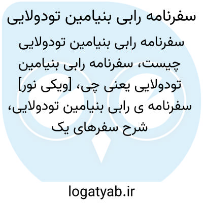 [ویکی فقه] سفرنامه رابی بنیامین تودولایی (کتاب). کتاب «سفرنامه ی رابی بنیامین تودولایی»، شرح سفرهای یک نویسنده یهودی قرن ششم هجری با موضوع پراکندگی قوم یهود است که به قلم خانم مهوش ناطق، به زبان فارسی ترجمه شده است. اصل کتاب به زبان عبری بوده و به دلیل ارزش تاریخی مستند آن، بارها گاه از روی متن اصلی و یا از زبان های دیگر ترجمه شده است.
