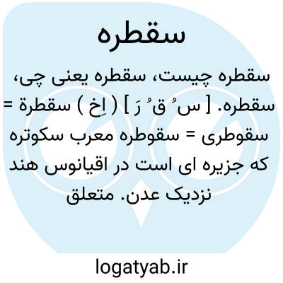 سقطره. [ س ُ ق ُ رَ ] ( اِخ ) سقطرة = سقوطری = سقوطره معرب سکوتره که جزیره ای است در اقیانوس هند نزدیک عدن. متعلق به انگلستان قریب 130 کیلومتر طول و 40 کیلومتر عرض دارد. مرکز جزیره شهر تاماریده است. سکنه جزیره در حدود 12000 تن است. محصول آن خرما،صبر زرد، سقوطری و گندز است. ( فرهنگ فارسی معین ).