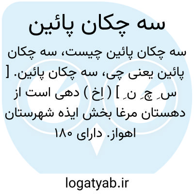 سه چکان پائین. [ س ِ چ ِ ن ِ ] ( اِخ ) دهی است از دهستان مرغا بخش ایذه شهرستان اهواز. دارای 180 تن سکنه. آب آن از چشمه و محصول آنجا غلات است. ( از فرهنگ جغرافیائی ایران ج 6 ).