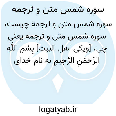 [ویکی اهل البیت] بِسْمِ اللَّهِ الرَّحْمَنِ الرَّحِیمِ به نام خدای بخشاینده مهربان سوگند به آفتاب و روشنی اش به هنگام، چاشت، وَالْقَمَرِ إِذَا تَلَاهَا و سوگند به ماه چون از پی آن بر آید، وَالنَّهَارِ إِذَا جَلَّاهَا و سوگند به روز چون گیتی را روشن کند،