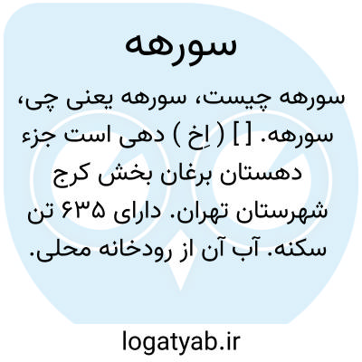سورهه. [ ] ( اِخ ) دهی است جزء دهستان برغان بخش کرج شهرستان تهران. دارای 635 تن سکنه. آب آن از رودخانه محلی. محصول آنجا غلات، میوه جات و لبنیات است. ( از فرهنگ جغرافیائی ایران ج 1 ).