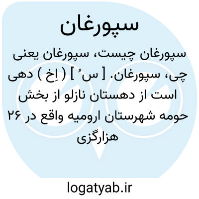 سپورغان. [ س ُ ] ( اِخ ) دهی است از دهستان نازلو از بخش حومه شهرستان ارومیه واقع در 26 هزارگزی شمال خاوری ارومیه، دارای راه ارابه رو است. هوای آن معتدل و دارای 335 تن سکنه است. آب آنجا از نازلوچای تأمین میشود. محصول آن غلات، توتون، چغندر، حبوبات، کشمش و شغل اهالی زراعت و صنایع دستی آنان جوراب بافی و راه آن ارابه رو است. ( از فرهنگ جغرافیایی ایران ج 4 ).