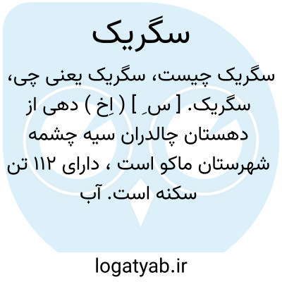 سگریک. [ س ِ ] ( اِخ ) دهی از دهستان چالدران سیه چشمه شهرستان ماکو است، دارای 112 تن سکنه است. آب آن از چشمه تأمین میشود و محصول آن غلات است. شغل اهالی زراعت و گله داری و صنایع دستی جاجیم و جوراب بافی است. ( از فرهنگ جغرافیایی ایران ج 4 ).