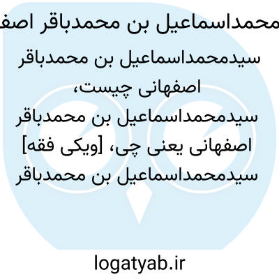 [ویکی فقه] سیدمحمداسماعیل بن محمدباقر اصفهانی (ابهام زدایی). سیدمحمداسماعیل بن محمدباقر اصفهانی ممکن است اشاره به اشخاص و شخصیت های ذیل باشد: • سیدمحمداسماعیل بن میرمحمدباقر گلستانه اصفهانی، از علما و فضلای اصفهان در قرن دوازده هجری• سیدمحمداسماعیل بن محمدباقر حسینی خاتون آبادی اصفهانی، از علمای اصفهان در قرن یازده هجری• سیدمحمداسماعیل بن محمدباقر حسینی خاتون آبادی ثالث، از علما و فقهای اصفهان در قرن دوازده هجری