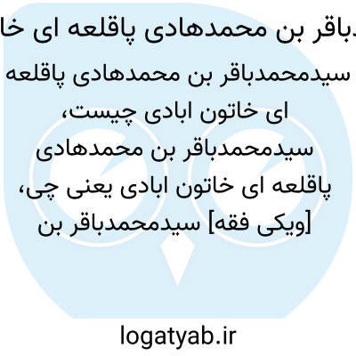 [ویکی فقه] سیدمحمدباقر بن محمدهادی پاقلعه ای خاتون آبادی. میرزامحمّدباقر بن میرمحمّد هادی بن میرزامحمّد خاتون آبادی، عارف سالک، از عرفای سلسله نعمت اللهی در اصفهان می باشد.