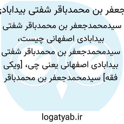 [ویکی فقه] سیدمحمدجعفر بن محمدباقر شفتی بیدآبادی اصفهانی. آقاسیّدمحمّدجعفر علم الهدی شفتی بن حاج سیّدمحمّدباقر ثانی بن حاج سیّداسداللّه بیدآبادی بن حاج سیّدمحمّدباقر حجةالاسلام شفتی، عالم فاضل در اصفهان می باشد.