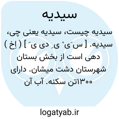سیدیه. [ س َی ْ ی ِ دی ی َ ] ( اِخ ) دهی است از بخش بستان شهرستان دشت میشان. دارای 1300تن سکنه. آب آن از رودخانه کرخه ( نهر هوقل ). محصول آنجا برنج، گاومیش، دارای صید ماهی و طیور. شغل اهالی زراعت و صنایع دستی حصیربافی است. ساکنین از طایفه بنی طرف هستند. ( از فرهنگ جغرافیائی ایران ج 6 ).