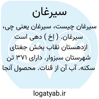 سیرغان. ( اِخ ) دهی است ازدهستان نقاب بخش جغتای شهرستان سبزوار. دارای 371 تن سکنه. آب آن از قنات. محصول آنجا غلات، کنجد و شغل اهالی زراعت است. ( از فرهنگ جغرافیائی ایران ج 9 ).