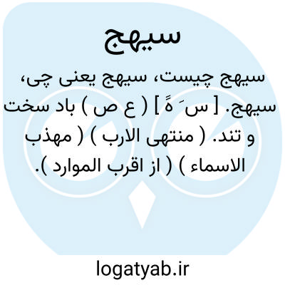 سیهج. [ س َ هََ ] ( ع ص ) باد سخت و تند. ( منتهی الارب ) ( مهذب الاسماء ) ( از اقرب الموارد ).