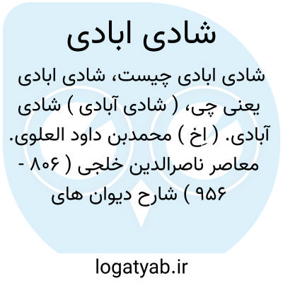 ( شادی آبادی ) شادی آبادی. ( اِخ ) محمدبن داود العلوی. معاصر ناصرالدین خلجی ( 806 - 956 ) شارح دیوان های انوری و خاقانی است. وی پیرو مذهب سنت و جماعت بود. شرح او بر دیوان انوری مملو از تکلفات بارد و حاکی از بی ذوقی و نداشتن انس با دواوین شعرا و عدم اطلاع از مبانی دستور زبان فارسی است. ( از رساله سیدجعفر شهیدی در شرح لغات علمی دیوان انوری و نقد شروح آن ). و رجوع به تاریخ ادبیات ایران تألیف صفا ج 2 ص 667 شود.