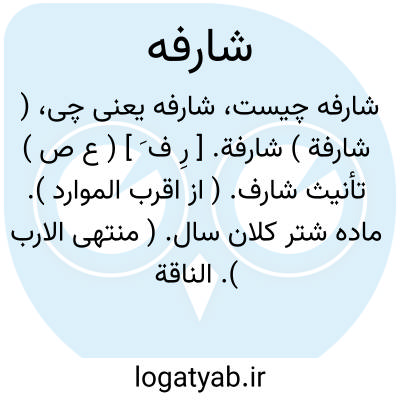 ( شارفة ) شارفة. [ رِ ف َ ] ( ع ص ) تأنیث شارف. ( از اقرب الموارد ). ماده شتر کلان سال. ( منتهی الارب ). الناقة المسنة الهرمة. ج، شارفات و شوارف. || ( اِ ) ظرف شراب از خم و سبو و مانند آن. ( از اقرب الموارد ). ج، شوارف. ( اقرب الموارد ).