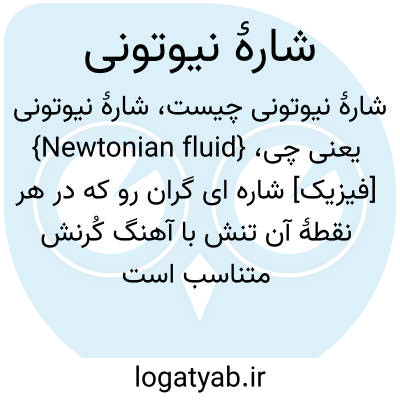 {Newtonian fluid} [فیزیک] شاره ای گران رو که در هر نقطۀ آن تنش با آهنگ کُرنش متناسب است