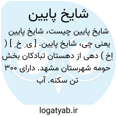 شایخ پایین. [ ی ِ خ ِ ] ( اِخ ) دهی از دهستان تبادکان بخش حومه شهرستان مشهد. دارای 300 تن سکنه. آب آن از رودخانه. محصول آن غلات است. ( از فرهنگ جغرافیایی ایران ج 9 ).