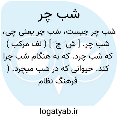 شب چر. [ ش َ چ َ ] ( نف مرکب ) که شب چرد. که به هنگام شب چرا کند. حیوانی که در شب میچرد. ( فرهنگ نظام ). || ( ن مف مرکب ) که شب چریده شود. || ( اِمص مرکب ) بردن حیوانات در شب به چرا کردن. ( فرهنگ نظام ). || ( اِ مرکب ) مخفف شب چره. شب چرا. رجوع به شب چره شود.