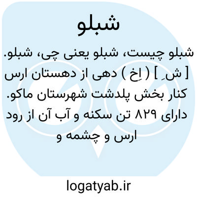 لغت نامه دهخدا شبلو. [ ش ِ ] ( اِخ ) دهی از دهستان ارس کنار بخش پلدشت شهرستان ماکو. دارای 829 تن سکنه و آب آن از رود ارس و چشمه و محصول آن غلات و پنبه است. ( از فرهنگ جغرافیائی ایران ج 4 ).