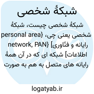 {personal area network, PAN} [رایانه و فنّاوری اطلاعات] شبکه ای که در آن همۀ رایانه های متصل به هم به صورت محلی قرار گرفته باشند