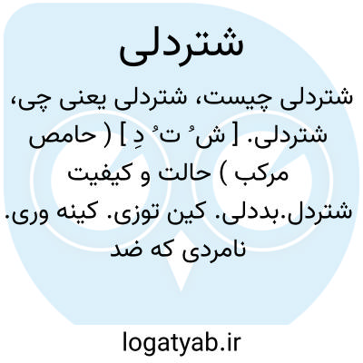 شتردلی. [ ش ُ ت ُ دِ ] ( حامص مرکب ) حالت و کیفیت شتردل.بددلی. کین توزی. کینه وری. نامردی که ضد بهادری است.( غیاث اللغات ). نامردی. ( ناظم الاطباء ):