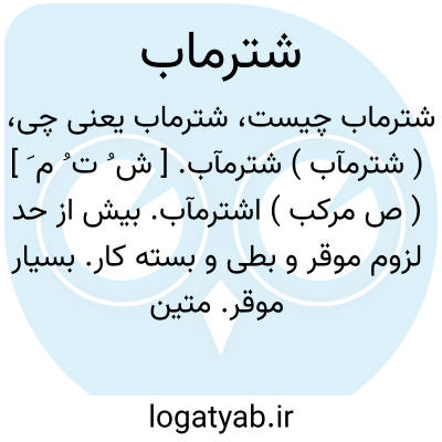 ( شترمآب ) شترمآب. [ ش ُ ت ُ م َ ] ( ص مرکب ) اشترمآب. بیش از حد لزوم موقر و بطی و بسته کار. بسیار موقر. متین زیاده از حد. ( فرهنگ فارسی معین ). || کهنه پرست. ( یادداشت مؤلف ). رجوع به اشترمآب شود.