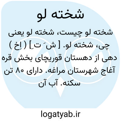 شخته لو. [ ش َ ت ِ] ( اِخ ) دهی از دهستان قوریچای بخش قره آغاج شهرستان مراغه. دارای 80 تن سکنه. آب آن از چشمه و محصول آن غلات و بزرک است. ( از فرهنگ جغرافیائی ایران ج 4 ).