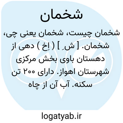 شخمان. [ ش ِ ] ( اِخ ) دهی از دهستان باوی بخش مرکزی شهرستان اهواز. دارای 200 تن سکنه. آب آن از چاه و محصول آن غلات است. ( از فرهنگ جغرافیائی ایران ج 6 ).