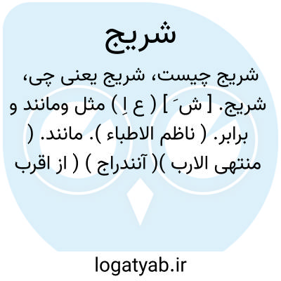 شریج. [ ش َ ] ( ع اِ ) مثل ومانند و برابر. ( ناظم الاطباء ). مانند. ( منتهی الارب )( آنندراج ) ( از اقرب الموارد ). || نوعی ازچوب که از وی کمان سازند. ( منتهی الارب ) ( آنندراج ) ( ناظم الاطباء ). || چوبی که آن را به دو نیمه شکافته باشند. ( ناظم الاطباء ) ( از اقرب الموارد ).