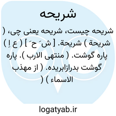 ( شریحة ) شریحة. [ ش َ ح َ ] ( ع اِ ) پاره گوشت. ( منتهی الارب ). پاره گوشت بدرازابریده. ( از مهذب الاسماء ) ( ناظم الاطباء ). شریح. شرحه. ( یادداشت مؤلف ). پاره ای از گوشت، مانند شرحة. ( از اقرب الموارد ). رجوع به شریح شود. || کمان که از دو چوب مختلف کرده باشند. ( مهذب الاسماء ).