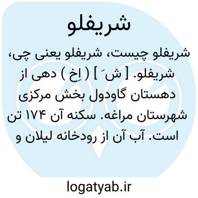 شریفلو. [ ش َ ] ( اِخ ) دهی از دهستان گاودول بخش مرکزی شهرستان مراغه. سکنه آن 174 تن است. آب آن از رودخانه لیلان و قنات تأمین می شود. محصول آنجا غلات و نخود و چغندرقند است. صنایع دستی زنان جاجیم بافی می باشد. ( از فرهنگ جغرافیایی ایران ج 4 ).