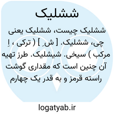 ششلیک. [ ش ِ ] ( ترکی، اِ مرکب ) سیخی. شیشلیک. طرز تهیه آن چنین است که مقداری گوشت راسته قرمز و به قدر یک چهارم آن دنبه را قطعه قطعه کرده با پیاز خردشده مخلوط نمایند و نصف روز در محل خنکی بگذارند و روی آن را سرکه و نمک و فلفل ریزند تا ترد شود. سپس چهار قطعه گوشت و یک قطعه دنبه را به ترتیب به سیخ باریک و بلند کشیده مانند کباب معمولی روی آتش پزند و آبدار بردارند و در قاب گذاشته روی آن کره و پیاز خردکرده ریزند. ( فرهنگ فارسی معین ).