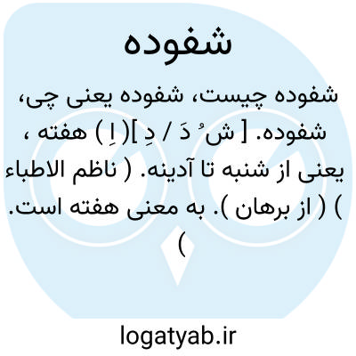 شفوده. [ ش ُ دَ / دِ ]( اِ ) هفته، یعنی از شنبه تا آدینه. ( ناظم الاطباء ) ( از برهان ). به معنی هفته است. ( آنندراج ) ( انجمن آرا )( از فرهنگ اوبهی ) ( از فرهنگ جهانگیری ):