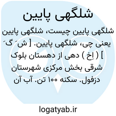 شلگهی پایین. [ ش َ گ َ ] ( اِخ ) دهی از دهستان بلوک شرقی بخش مرکزی شهرستان دزفول. سکنه 100 تن. آب آن از رودخانه دز. محصول عمده آنجا غلات وبرنج و کنجد است. ( از فرهنگ جغرافیایی ایران ج 6 ).