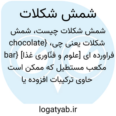 {chocolate bar} [علوم و فنّاوری غذا] فراورده ای مکعب مستطیل که ممکن است حاوی ترکیبات افزوده یا پرکننده هایی مانند دانه های آجیل یا تافی یا بیسکویت یا میوۀ خشک باشد