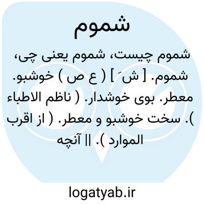 شموم. [ ش َ ] ( ع ص ) خوشبو. معطر. بوی خوشدار. ( ناظم الاطباء ). سخت خوشبو و معطر. ( از اقرب الموارد ). || آنچه بوییدنی است از گل و سپرغم و مانند آن. بوییدنی. ج، شمومات.( یادداشت مؤلف ). چیز بوییدنی. ( آنندراج ). || دارویی باشد که ببویند. ( ذخیره خوارزمشاهی ).