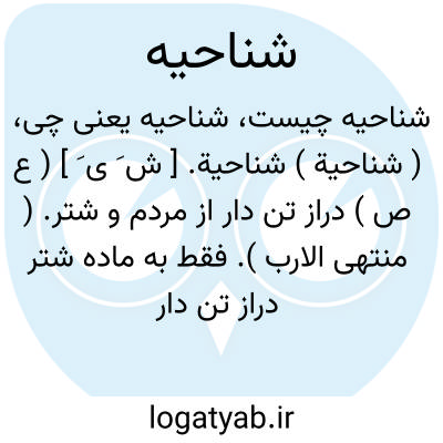 ( شناحیة ) شناحیة. [ ش َ ی َ ] ( ع ص ) دراز تن دار از مردم و شتر. ( منتهی الارب ). فقط به ماده شتر دراز تن دار و شادمان اطلاق شود: بکرة شناحیة. ( از اقرب الموارد ) ( ناظم الاطباء ). || دختر دراز و شادمان و سمین و فربه. ( ناظم الاطباء ).