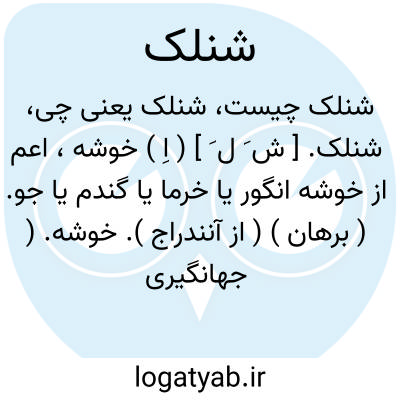 شنلک. [ ش َ ل َ ] ( اِ ) خوشه، اعم از خوشه انگور یا خرما یا گندم یا جو. ( برهان ) ( از آنندراج ). خوشه. ( جهانگیری ). سنبل. خوشه غله و خوشه انگور و خوشه خرما. ( ناظم الاطباء ).
