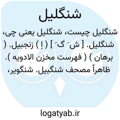 شنگلیل. [ ش َ گ َ ] ( اِ ) زنجبیل. ( برهان ) ( فهرست مخزن الادویه ). ظاهراً مصحف شنگبیل. شنگویر، شنگبیز، شنگویل و شنگبیل؛ بوزن و بمعنی زنجبیل که معرب آن است. ( رشیدی ). رجوع به شنگبیز شود. ( حاشیه ٔبرهان چ معین ). زنجبیل. زنجفیل. ( یادداشت مؤلف ).
