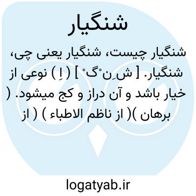 لغت نامه دهخدا شنگیار. [ ش ِن ْگ ْ ] ( اِ ) نوعی از خیار باشد و آن دراز و کج میشود. ( برهان )( از ناظم الاطباء ) ( از آنندراج ). رجوع به شنگ شود.