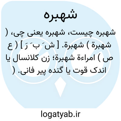 لغت نامه دهخدا ( شهبرة ) شهبرة. [ ش َ ب َ رَ ] ( ع ص ) امراءة شهبرة؛ زن کلانسال یا اندک قوت یا گنده پیر فانی. ( منتهی الارب ) ( از اقرب الموارد ). پیرزن. ( نصاب ) ( نشوءاللغة ص 17 ).شهبرة. [ ش َ ب َ رَ ] ( ع مص ) مایل به سپیدی شدن ریش پشت شتر: شهبردبرالبعیر شهبرةً. || آماده گریستن گردیدن. ( منتهی الارب ). سخت گریستن. ( از اقرب الموارد ).