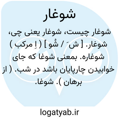 شوغار. [ ش َ / شُو ] ( اِ مرکب ) شوغاره. بمعنی شوغا که جای خوابیدن چارپایان باشد در شب. ( از برهان ). شوغا. شوغاره. شوگا. خاربست و محوطه باشد که گوسفندان را در آن کنند. ( از آنندراج ). آغل. و رجوع به شوغا شود:
