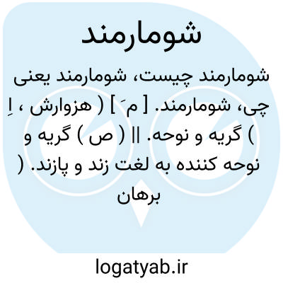 لغت نامه دهخدا شومارمند. [ م َ ] ( هزوارش، اِ ) گریه و نوحه. || ( ص ) گریه و نوحه کننده به لغت زند و پازند. ( برهان ). گریان و زاری کنان. ( ناظم الاطباء ).