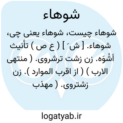 شوهاء. [ ش َ ] ( ع ص ) تأنیث اَشْوَه. زن زشت ترشروی. ( منتهی الارب ) ( از اقرب الموارد ). زن زشتروی. ( مهذب الاسماء ). || زن نیکوروی ( از اضداد ). || زن شوم نامبارک. ( از اقرب الموارد )( منتهی الارب ). || اسب دراز نیکومنظر یا گشاده دهان گشاده منخرین و این صفت نیکوست در آن. ( منتهی الارب ). اسب فراخ دهن. ( مهذب الاسماء ). یا اسب تنگ دهان ( از اضداد ). ( از منتهی الارب ) ( از اقرب الموارد ).