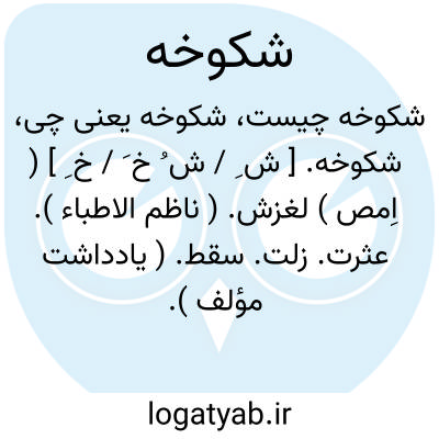 شکوخه. [ ش ِ / ش ُ خ َ / خ ِ ] ( اِمص ) لغزش. ( ناظم الاطباء ). عثرت. زلت. سقط. ( یادداشت مؤلف ). || عثرت زبان. ( یادداشت مؤلف ). || لغزش قلم. عثرت قلم. طغیان قلم. ( یادداشت مؤلف ). || سقوط. افتادگی. ( ناظم الاطباء ). سکندری. سکندری خوردن. ( یادداشت مؤلف ).