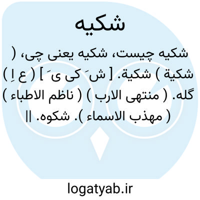 ( شکیة ) شکیة. [ ش َ کی ی َ ] ( ع اِ ) گله. ( منتهی الارب ) ( ناظم الاطباء ) ( مهذب الاسماء ). شکوه. || بیماری. ج، شکایا. ( ناظم الاطباء ). بیماری. ( منتهی الارب ) ( آنندراج ). || بقیه چیزی. ( منتهی الارب ) ( ناظم الاطباء ) ( آنندراج ).
