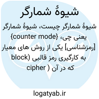 {counter mode} [رمزشناسی] یکی از روش های معیار به کارگیری رمز قالبی (block cipher ) که در آن ابتدا دنباله ای از اعداد به عنوان ورودی خوارزمی/ الگوریتم رمز وارد می شود، سپس قالب های متن اصلی به ترتیب با قالب های خروجی خوارزمی رمز ترکیب می شوند تا متن رمزشدۀ متناظر با...