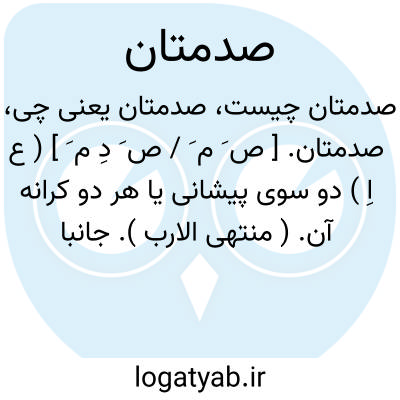 صدمتان. [ ص َ م َ / ص َ دِ م َ ] ( ع اِ ) دو سوی پیشانی یا هر دو کرانه آن. ( منتهی الارب ). جانبا الحاجبین. ( بحر الجواهر ).هر دو سوی پیشانی و هر دو سوی رو. ( مهذب الاسماء ).