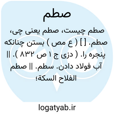 صطم. [ ] ( ع مص ) بستن چنانکه پنجره را. ( دزی ج 1 ص 832 ). || آب فولاد دادن. سطم. || صطم الفلاح السکة؛ علق علی رأسها الفولاذ لتطول و تقوی علی شق الارض. ( محیط المحیط ) ( دزی ج 1 ص 832 ).