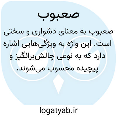 صعبوب به معنای دشواری و سختی است. این واژه به ویژگی‌هایی اشاره دارد که به نوعی چالش‌برانگیز و پیچیده محسوب می‌شوند. در زبان عربی، صعبوب به عنوان صفتی برای توصیف موقعیت‌ها یا امور مشکل‌ساز به کار می‌رود. به طور کلی، می‌توان گفت که این واژه با مفهوم سختی و دشواری در ارتباط است و در مواردی که انجام یک کار یا دستیابی به هدفی با موانع جدی مواجه می‌شود، به کار می‌رود. به همین دلیل، در ادبیات و مکالمات مختلف، استفاده از این واژه می‌تواند نمایانگر عمق و پیچیدگی مسائل باشد.