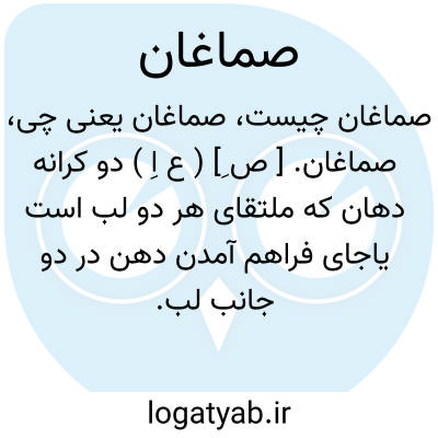 لغت نامه دهخدا صماغان. [ ص ِ] ( ع اِ ) دو کرانه دهان که ملتقای هر دو لب است یاجای فراهم آمدن دهن در دو جانب لب. ( منتهی الارب ).