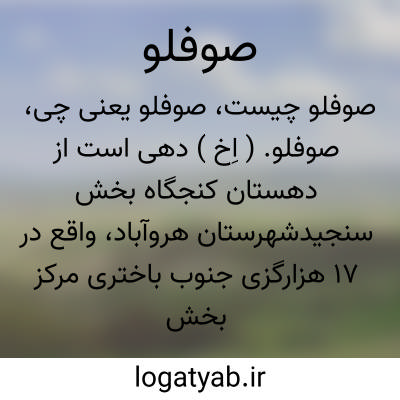 صوفلو. ( اِخ ) دهی است از دهستان کنجگاه بخش سنجیدشهرستان هروآباد، واقع در 17 هزارگزی جنوب باختری مرکز بخش گیوی و 5 هزارگزی شوسه میانه اردبیل. کوهستانی و هوای آن معتدل است. 439 تن سکنه دارد. آب آن از چشمه. محصول آنجا غلات، حبوبات. شغل اهالی زراعت. راه آن مالرو است. ( از فرهنگ جغرافیائی ایران ج 4 ).