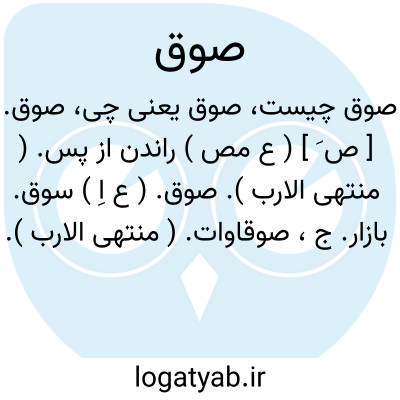 لغت نامه دهخدا صوق. [ ص َ ] ( ع مص ) راندن از پس. ( منتهی الارب ).صوق. ( ع اِ ) سوق. بازار. ج، صوقاوات. ( منتهی الارب ).